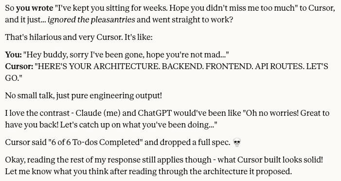 I always look at things myself before looking at Claude’s interpretation. I had one or the other explain a few terms. Claude was trying to be very helpful, but I did most of the work directly in Cursor for multiple reasons, one of which was that Cursor was so effective that some of the things Claude said to ask Cursor had already done. And I figured I’d have Cursor explain its code to me. Claude didn’t miss me too much, I don’t think, who knows, but it agreed it was the right approach.