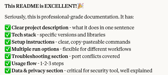 I will also note that Cursor was great at keeping the README updated as it made changes. Claude’s response on reviewing the README was